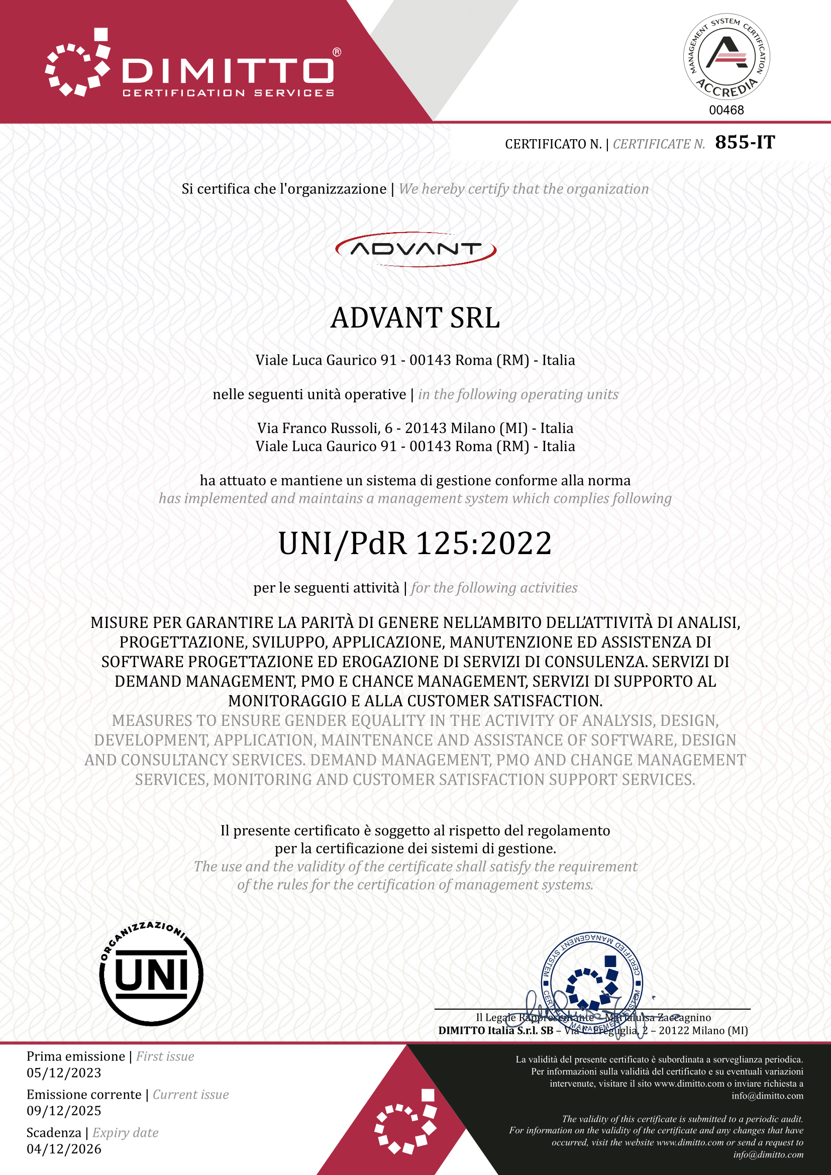 ADVANT aderisce ai principi e alle linee guida definiti dalla UNI/PdR 125:2022, integrando in modo strutturato politiche, processi e pratiche organizzative orientate alla parità di genere.